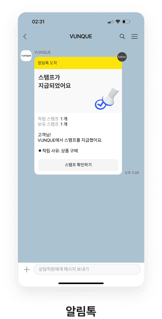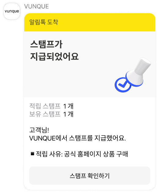 주문 배송완료시 스탬프 적립 알림톡이 자동으로 고객에게 발송됩니다.